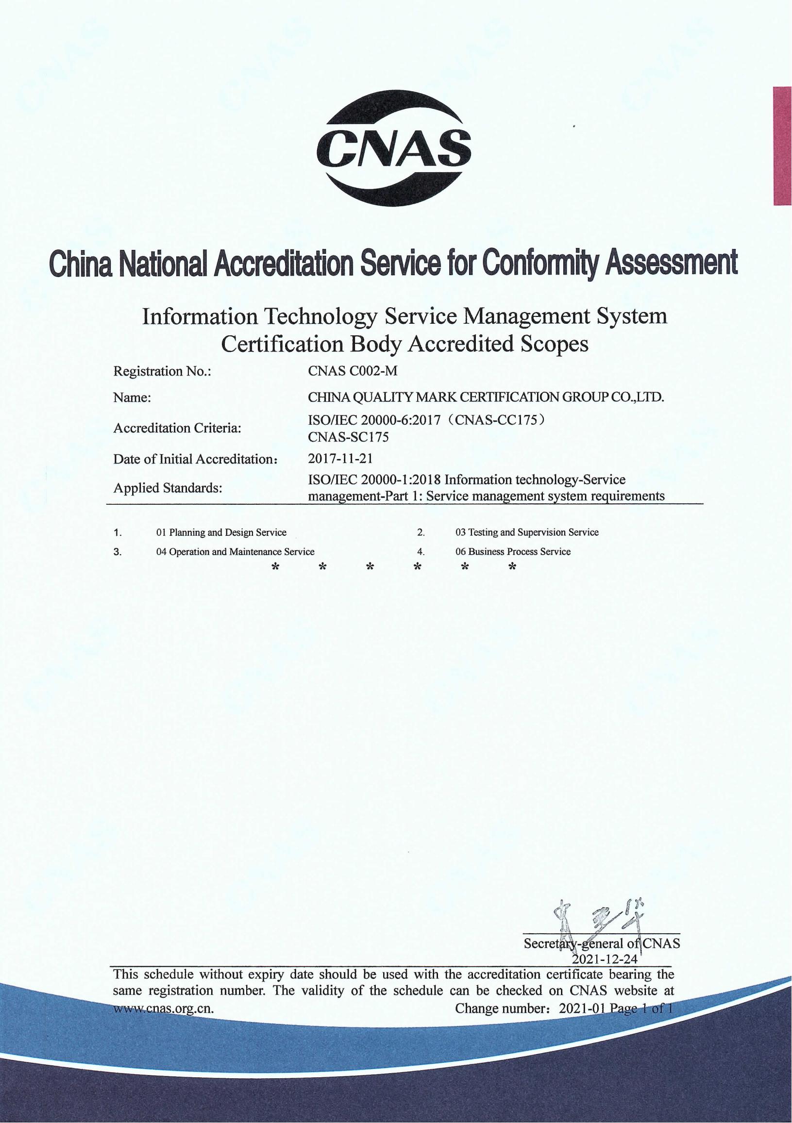 信息技术服务管理体系认证认可证书