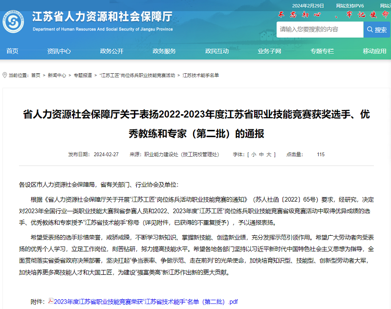 时间:2024年02月29日 热烈祝贺黄文君同志在2023年度江苏省职业技能竞赛中荣获“江苏省技术能手”称号!