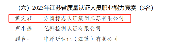 近日,江苏省人力资源和社会保障厅发布《关于表扬2022-2023年度江苏省职业技能竞赛获奖选手、优秀教练和专家(第二批)的通报》,对由江苏省市场监管局举办的首届质量认证人员职业能力竞赛中取得优异成绩的选手授予“江苏省技术能手”称号,予以通报表扬。这是对方圆江苏公司技术实力和人才培养机制的充分肯定,也是对黄文君同志个人专业技能和辛勤努力的褒奖。