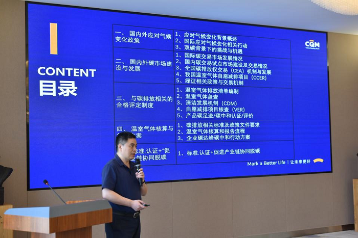 吕军以《“标准·认证+”助力产业链绿色低碳高质量发展》为题,从国际气候变化政策和碳足迹实践,国内外碳市场建设的现状与前景等方面展开,围绕工业企业如何做好节能降碳工作进行专业讲解,还对企业温室气体核算、碳达峰碳中和行动方案予以系统介绍。课程内容丰富,讲授深入浅出,培训反响热烈。